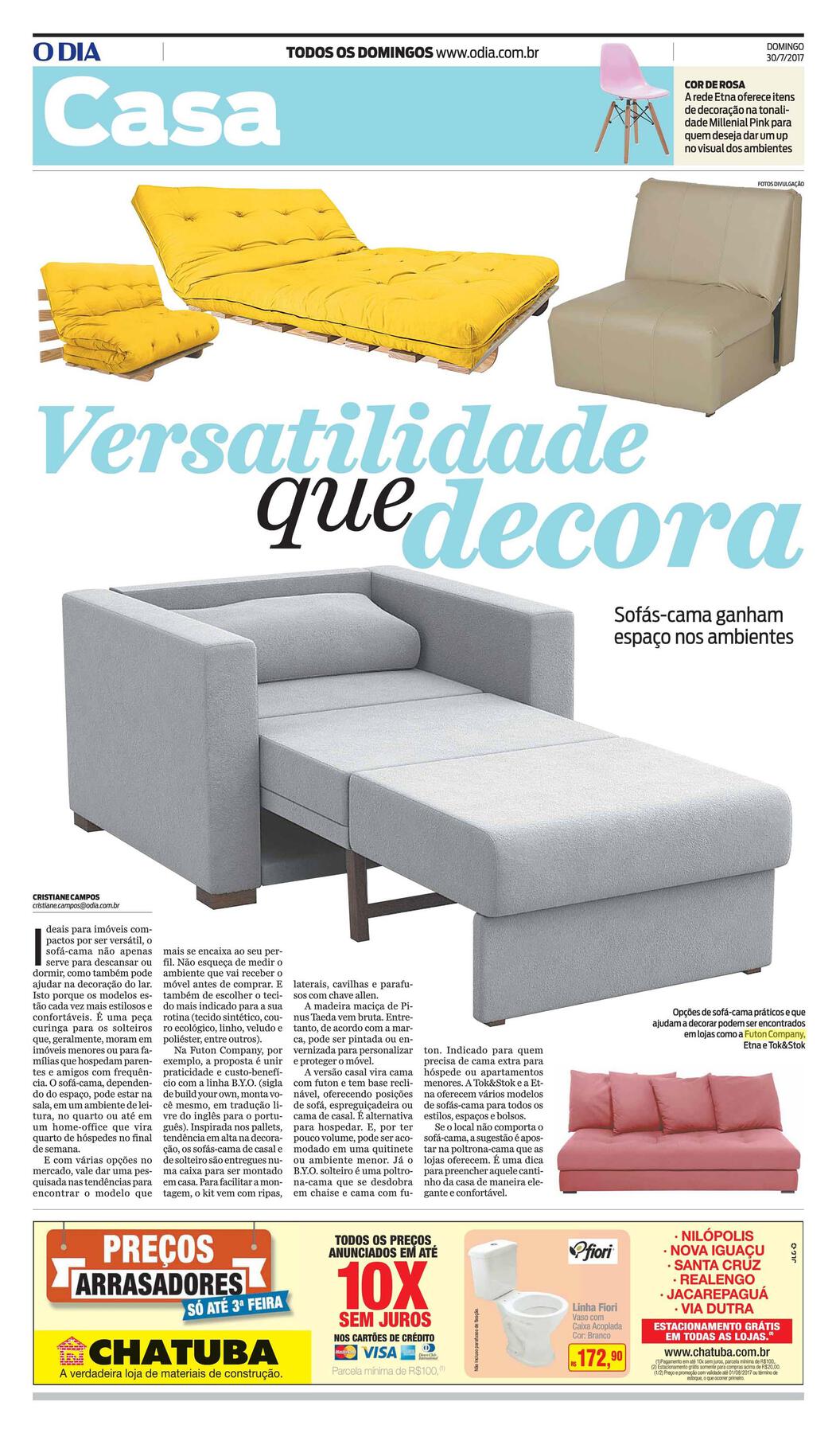 O Jornal O Dia do fim de julho de 2017, traz matéria voltada para móveis versáteis como o B.Y.O da Futon Company. O sofá-cama pode ser utilizado por pelo menos duas pessoas na posição de sofá, espreguiçadeira ou cama. O B.Y.O. é perfeito para cômodos compactos. Seja para descansar ou dormir, também complementa a decoração. O sofá-cama B.Y.O. está disponível através da Futon Company.