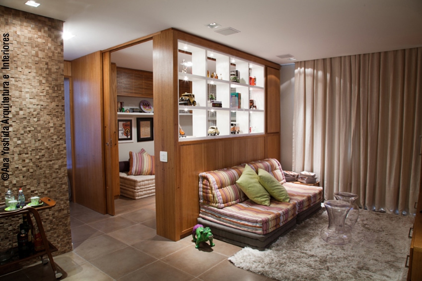 A arquiteta Ana Yoshida foi responsável pelo projeto de reforma e decoração do apartamento na Bela vista de São Paulo. Interessante é como foi otimizado o espaço da cozinha e living em 17,5 m². O espaço foi aberto, porém a arquiteta soube preservar um espaço intimista graças à porta de correr que abre e fecha a vontade.