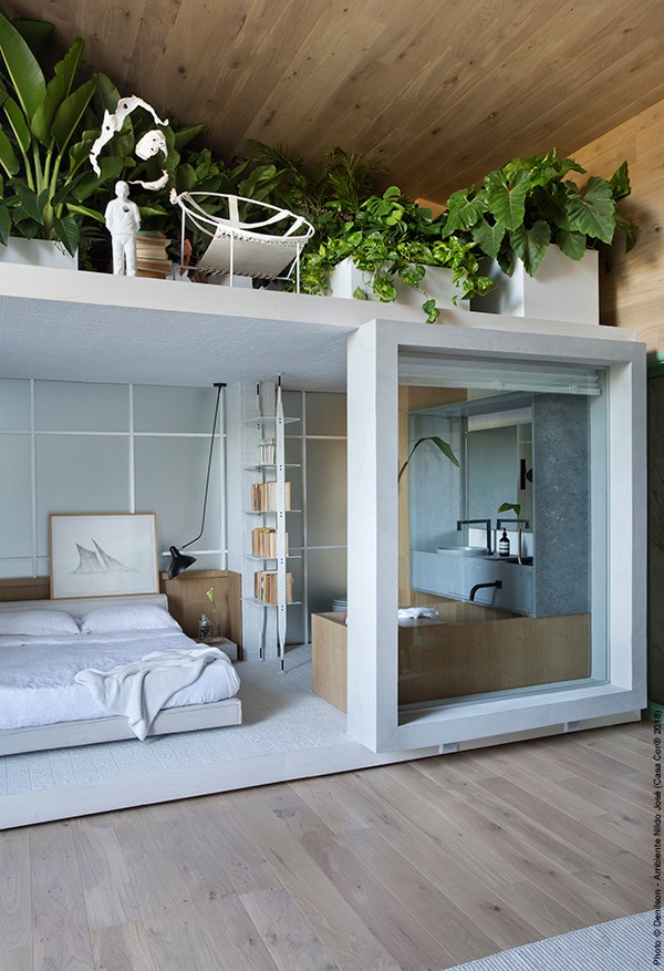 Centralizada no teto do loft, a clássica poltrona FDC1 traz leveza neste terraço-jardim idealizado na área íntima do loft. O espaço de bem-estar busca a desconexão do morador e a meditação com uma atmosfera acolhedora. “É um ambiente capaz de criar e despertar memórias, que abraçam a alma, e os quais completam seus moradores, transformando-se em verdadeiros ninhos”, explica o Profissional.