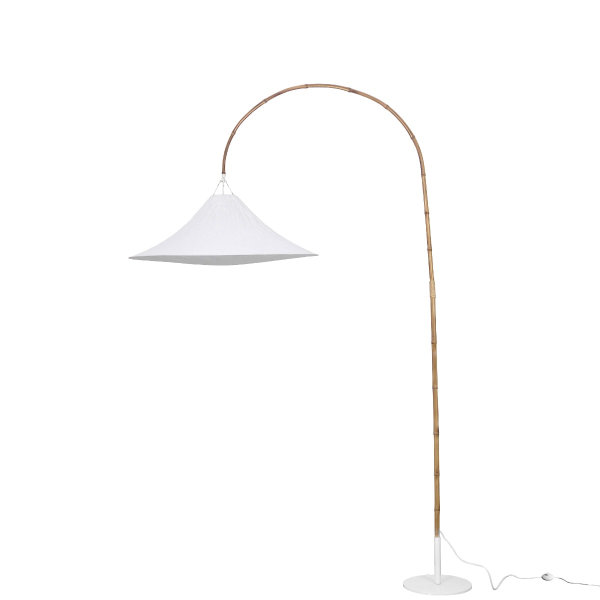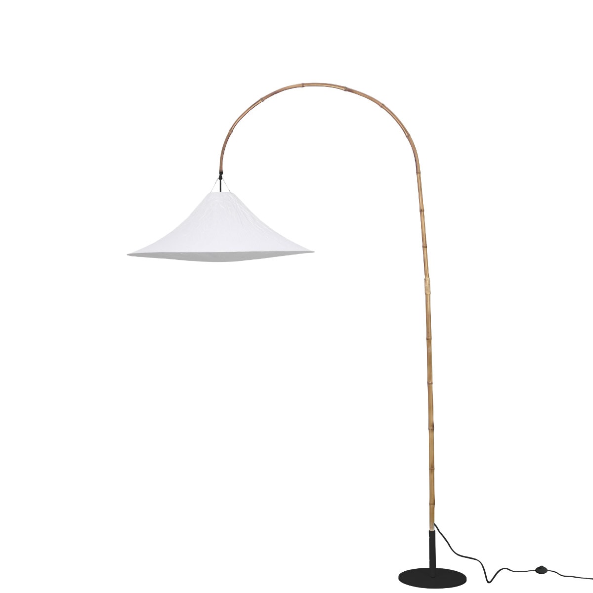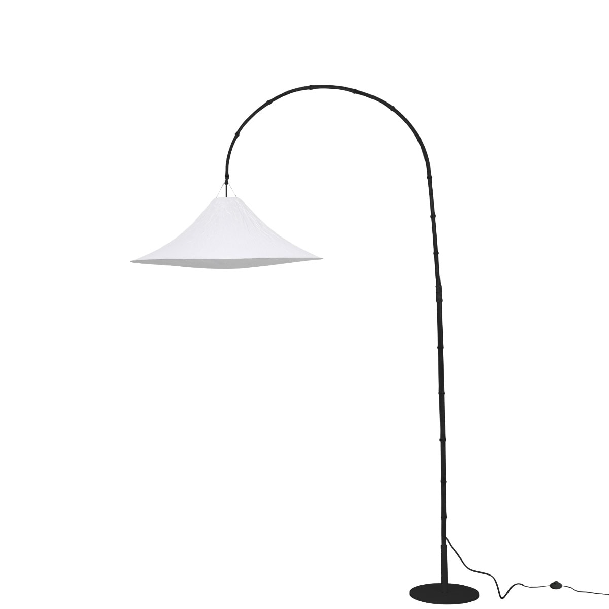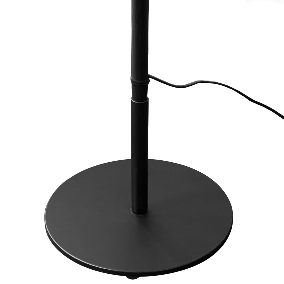 Sua base metálica é produzida em metal com pintura epóxi em preto ou branco, garantindo estabilidade, longa durabilidade e um acabamento uniforme de alta qualidade. A luminária possui interruptor de piso redondo, facilitando o acionamento sem interferir na estética da peça.