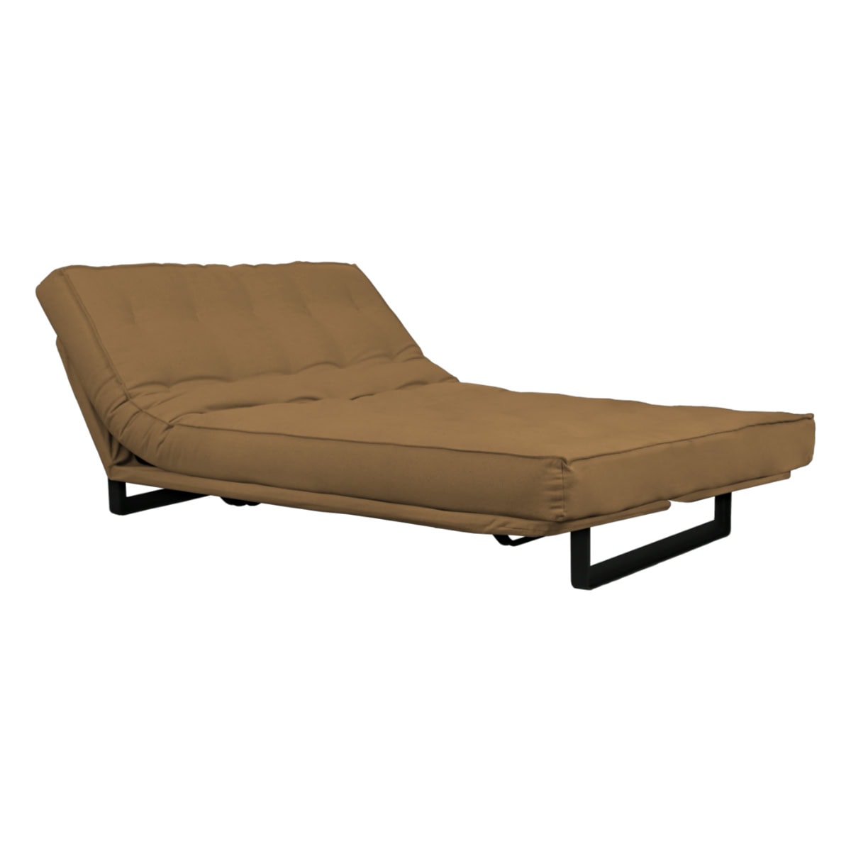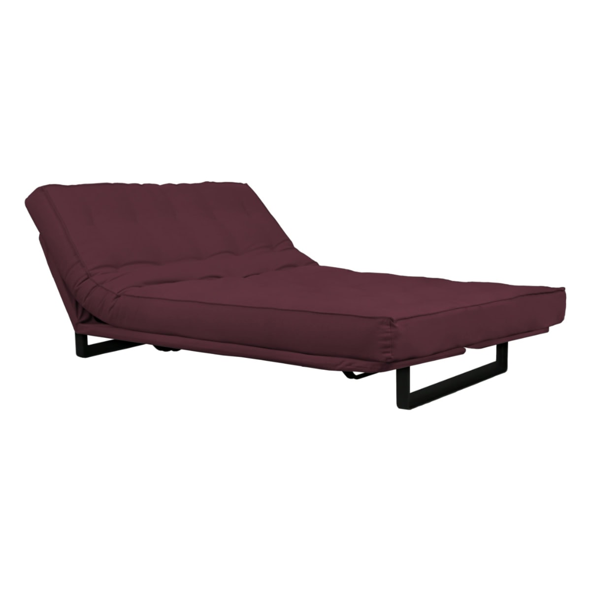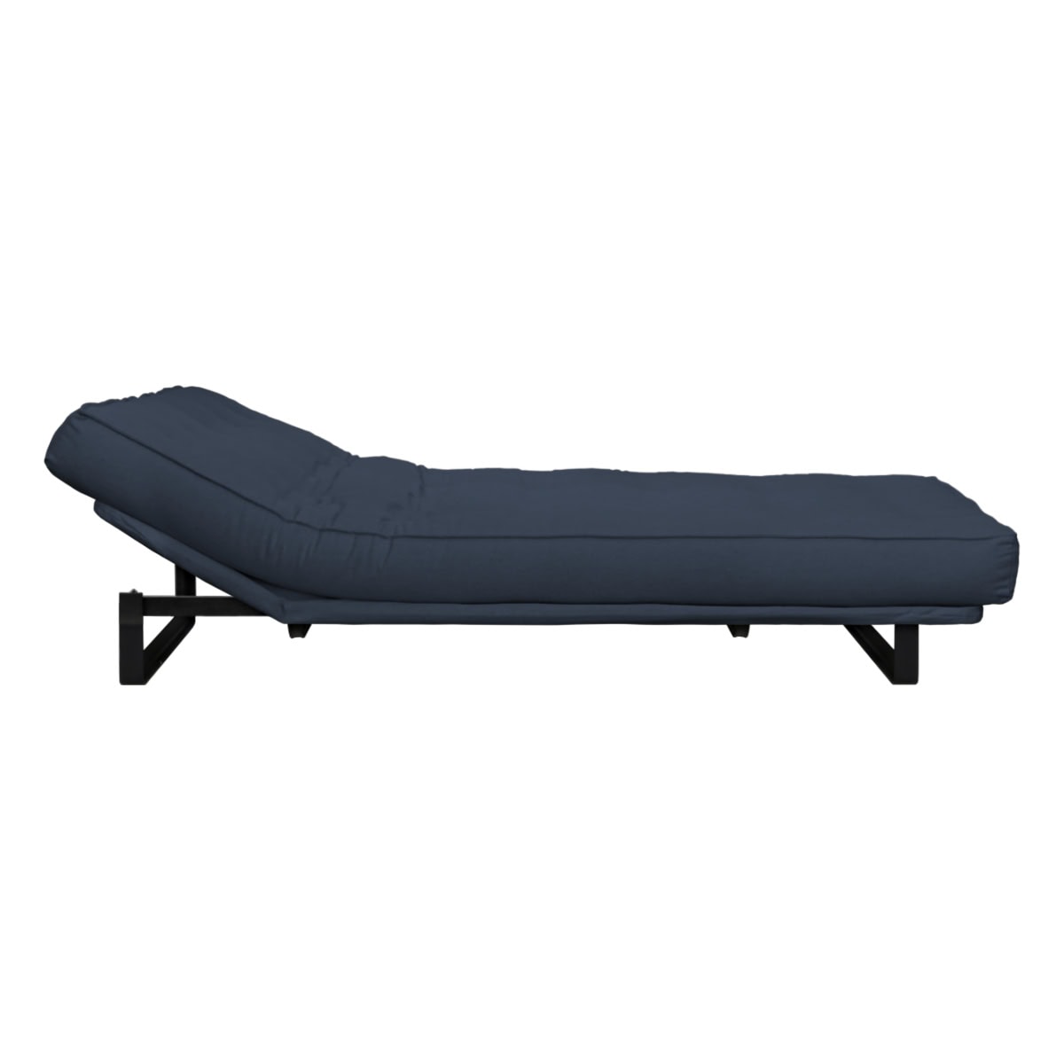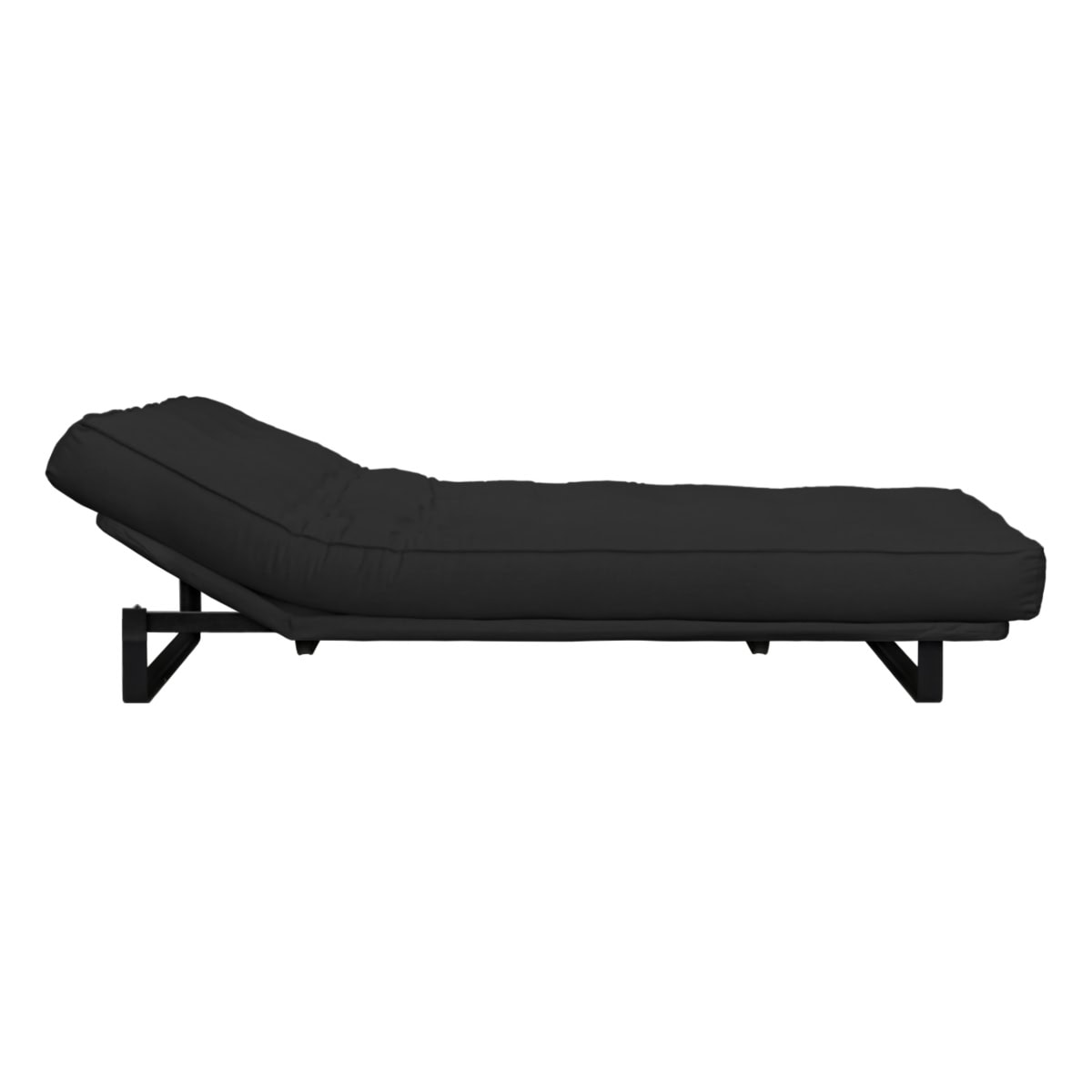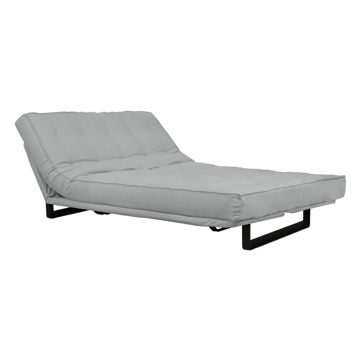 Sofá-cama multifuncional com base metálica preta e futon sharp. 3 posições: sofá, cama e chaise.