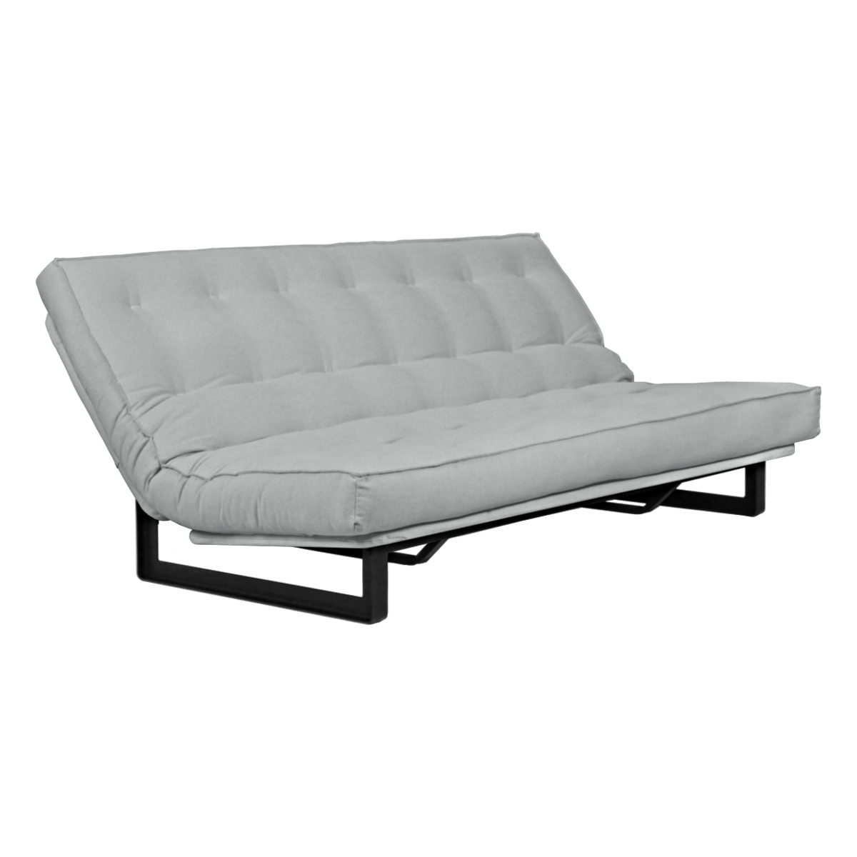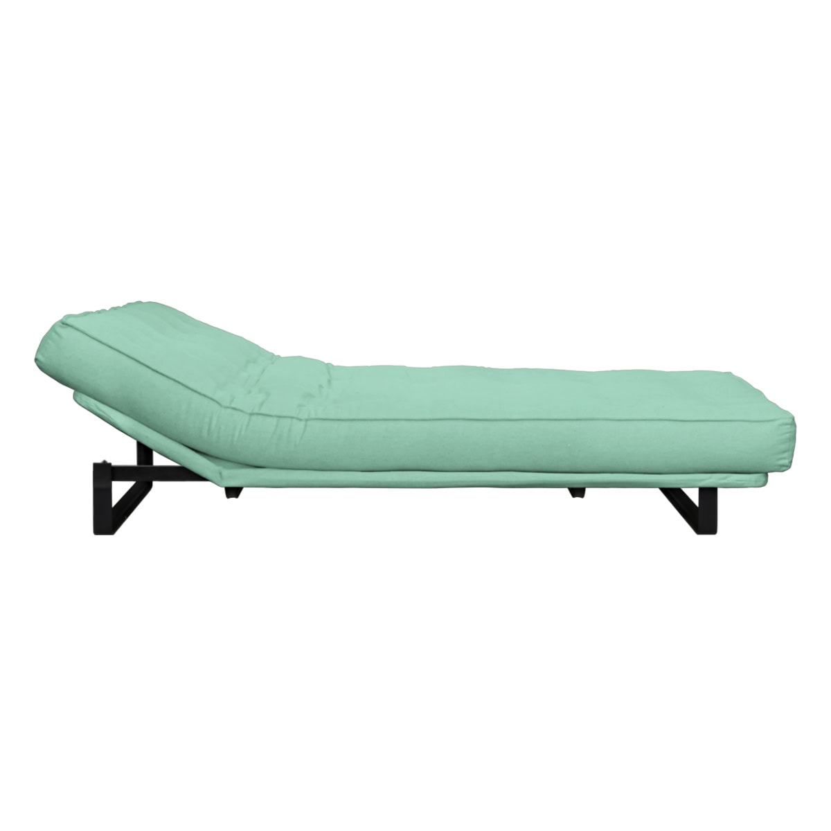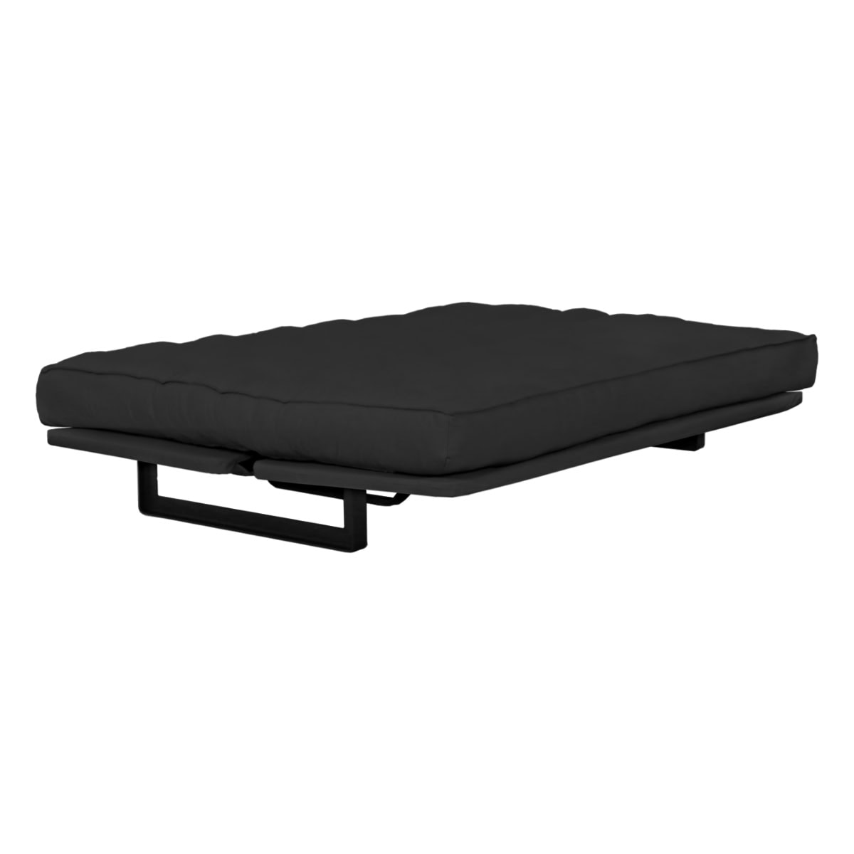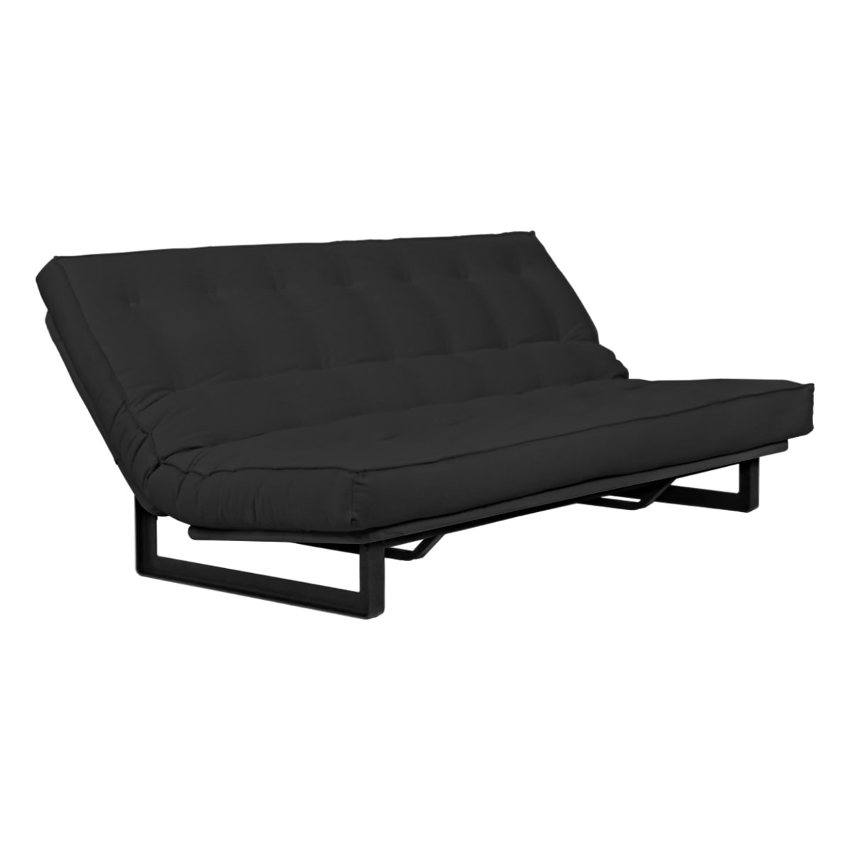 Sofá-cama multifuncional com base metálica preta e futon sharp. 3 posições: sofá, cama e chaise.