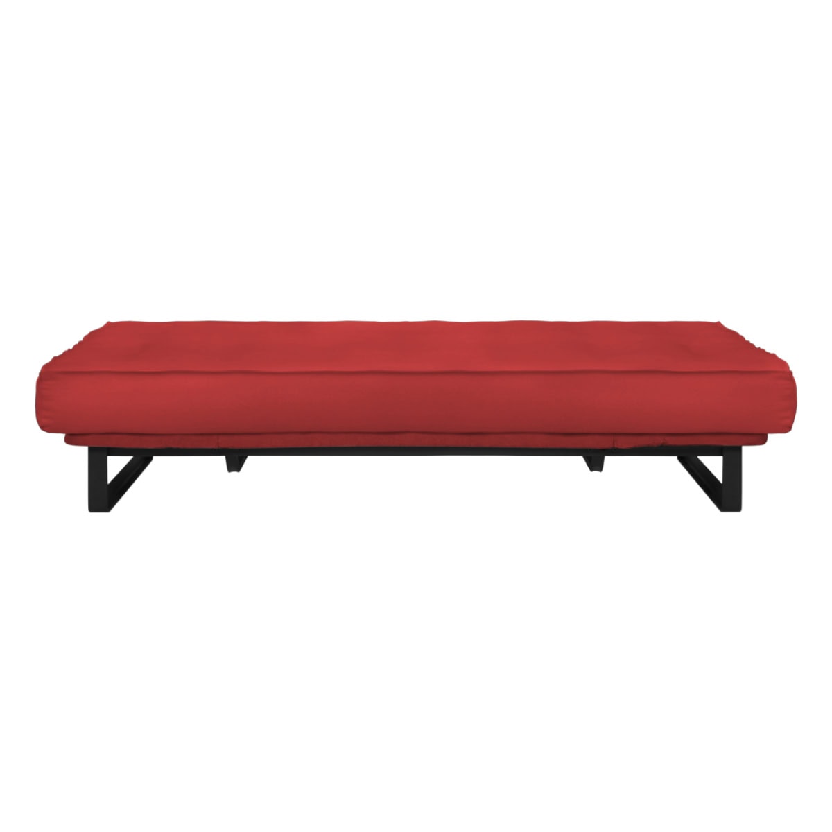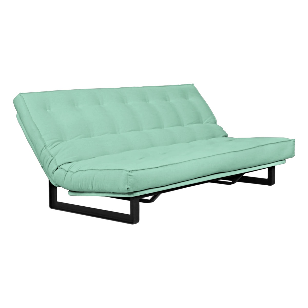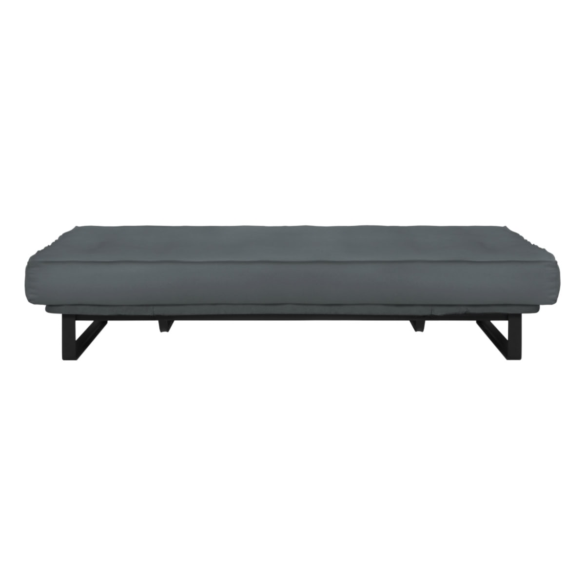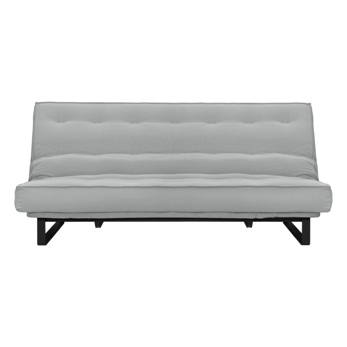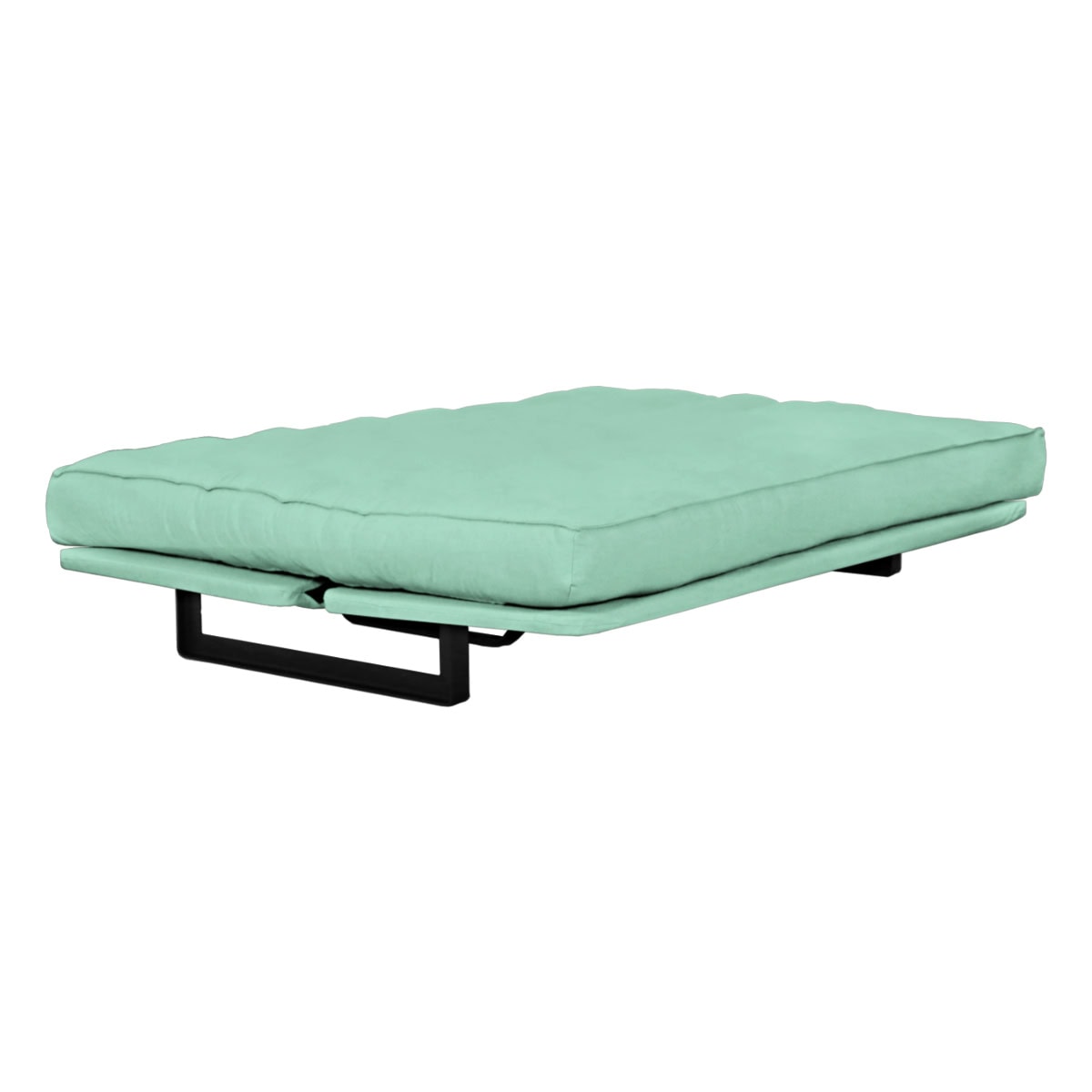 Sofá-cama multifuncional com base metálica preta e futon sharp. 3 posições: sofá, cama e chaise.