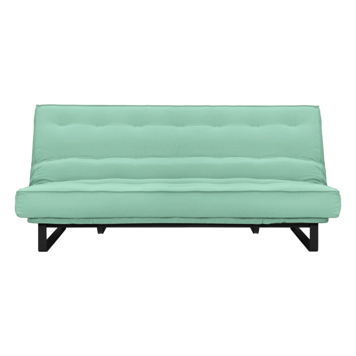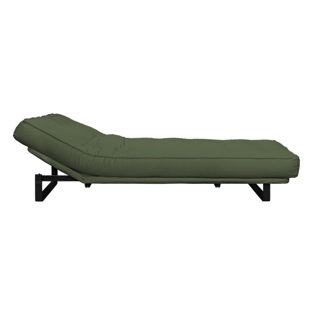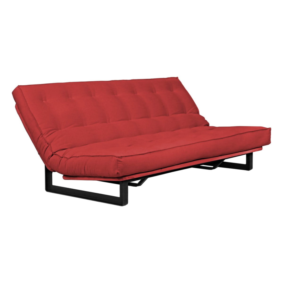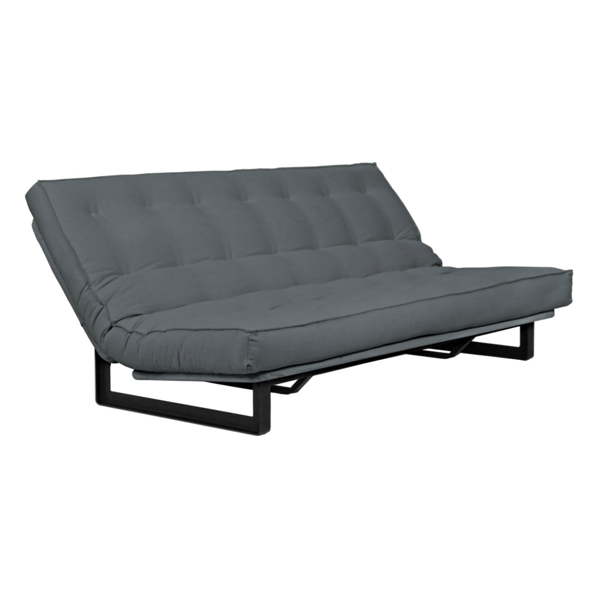 Sofá-cama multifuncional com base metálica preta e futon sharp. 3 posições: sofá, cama e chaise.