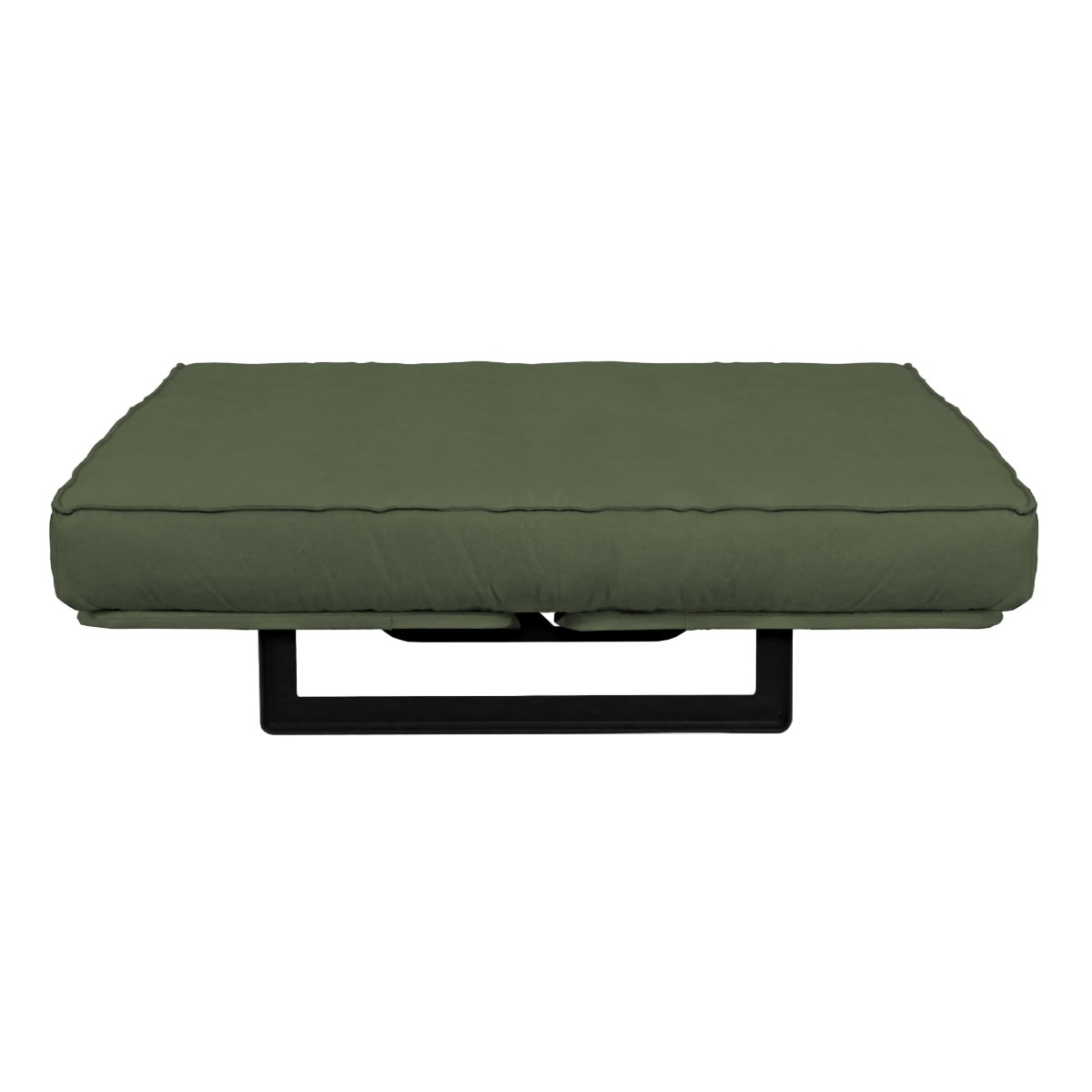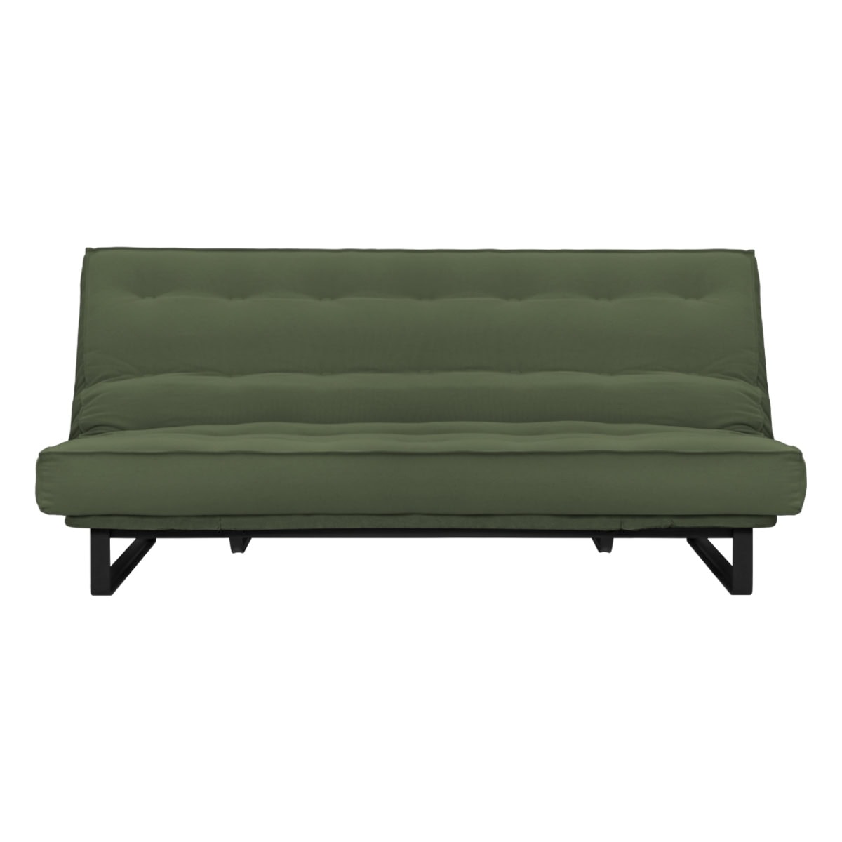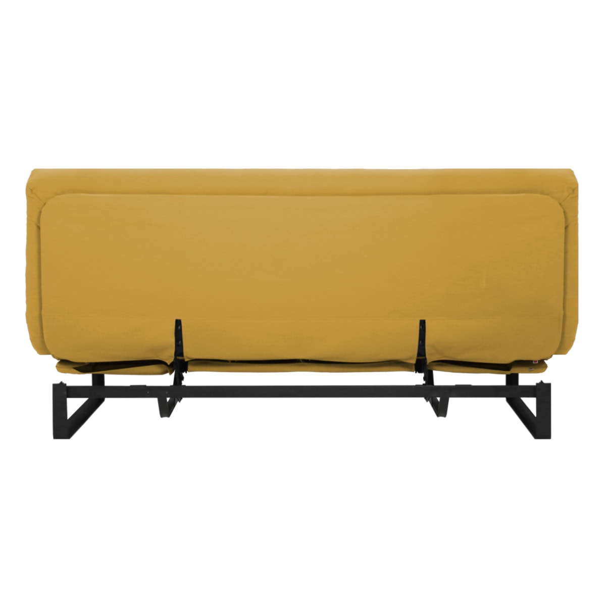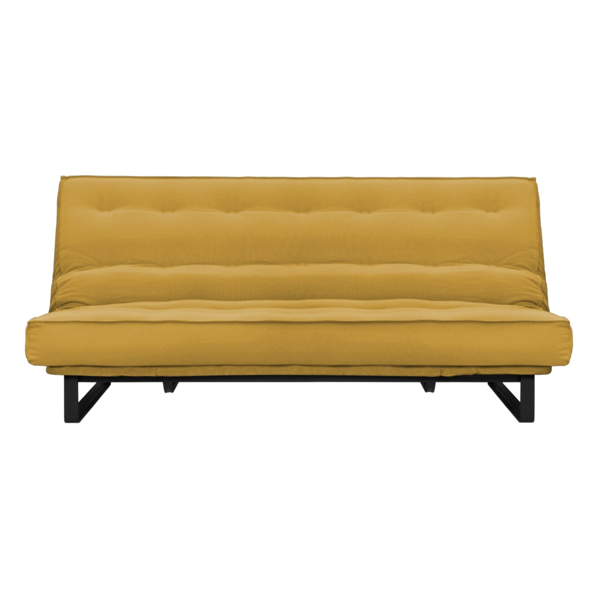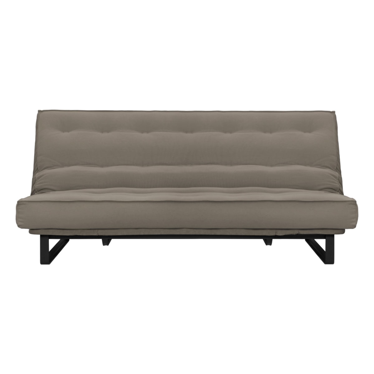Sofá-cama multifuncional com base metálica preta e futon sharp. 3 posições: sofá, cama e chaise.