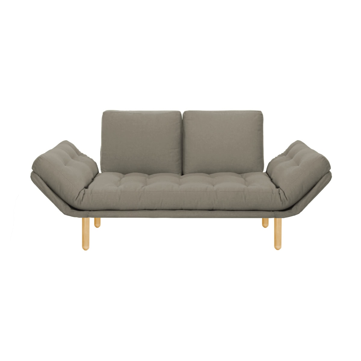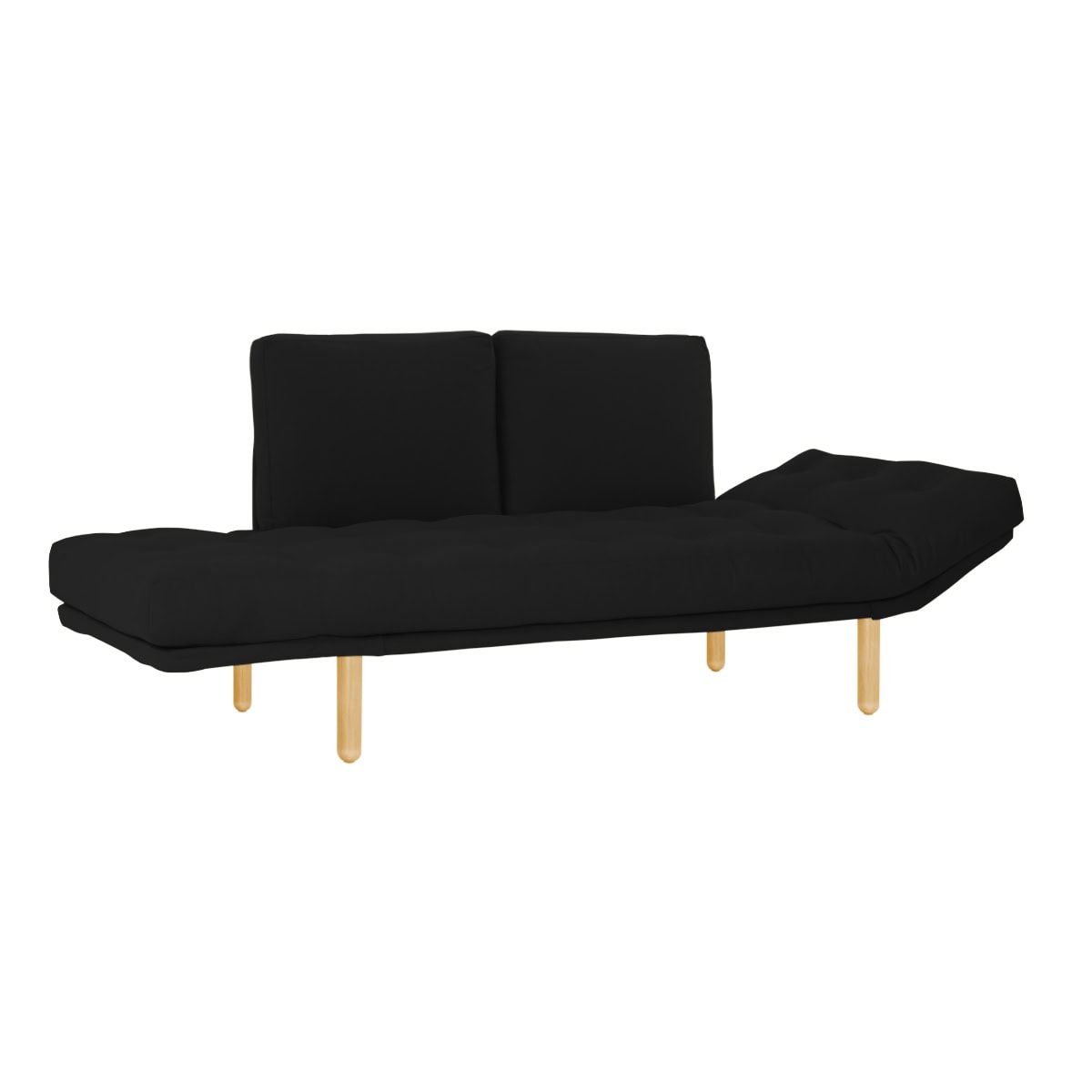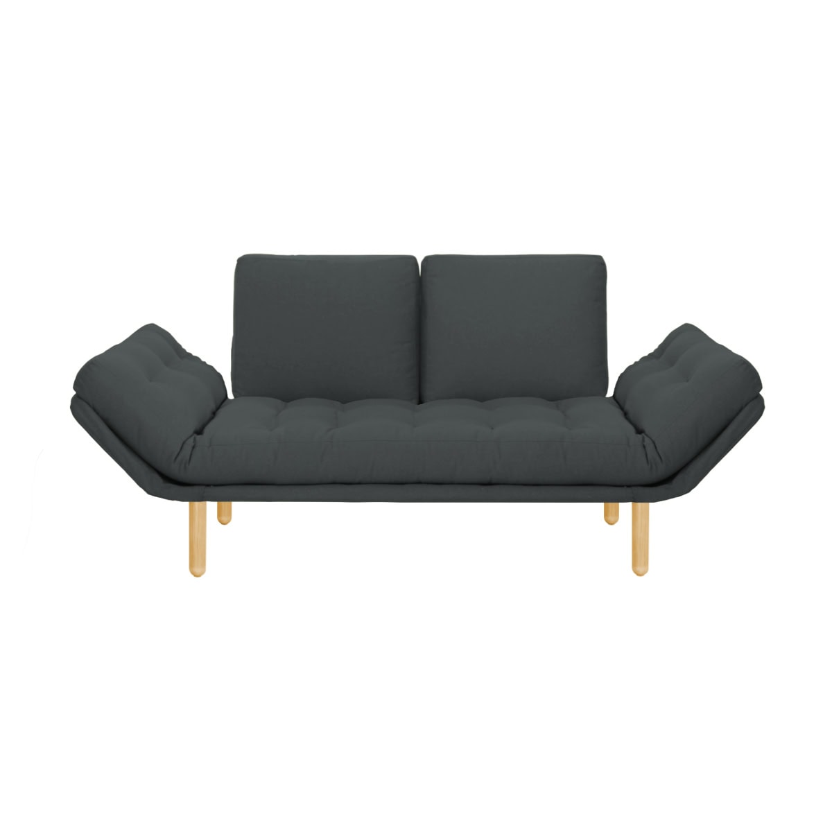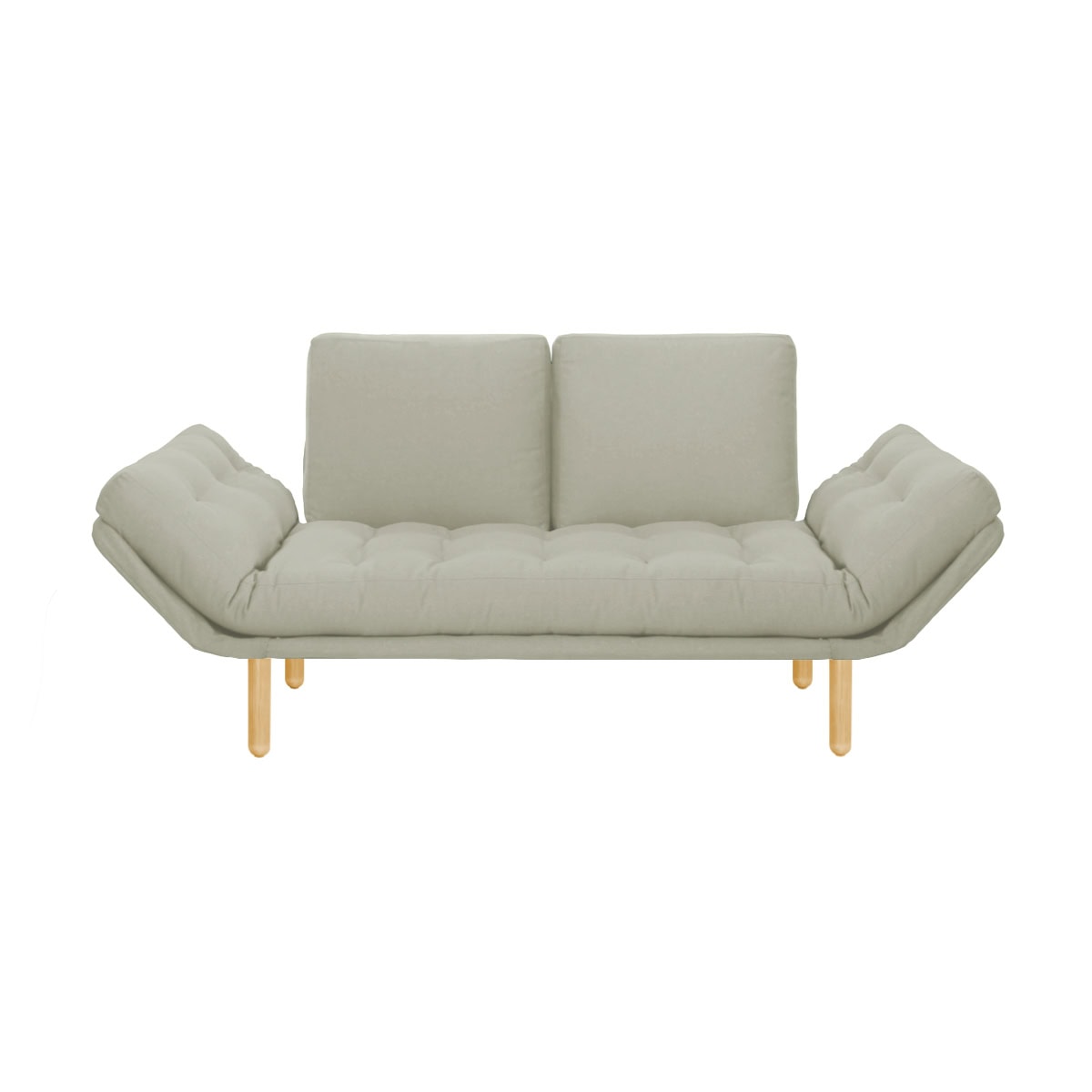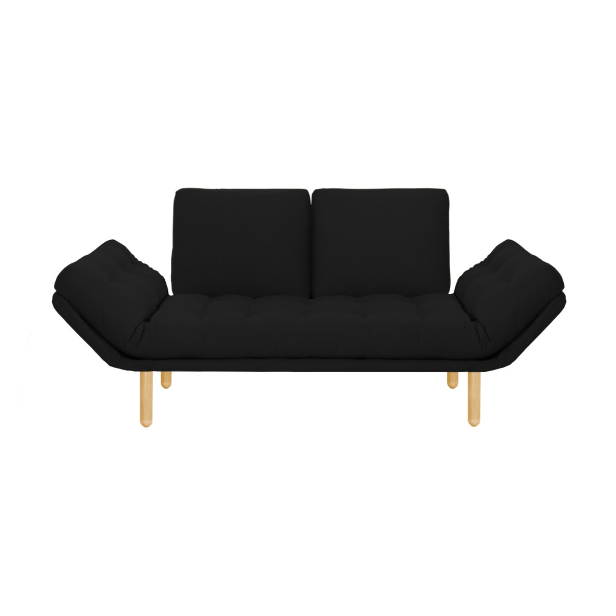 Design 60’s para esse sofá e cama New Oslo com pés Round. Equipado de futon revestido de tecido Ecolona, braços articulados, compacto, estiloso e confortável.