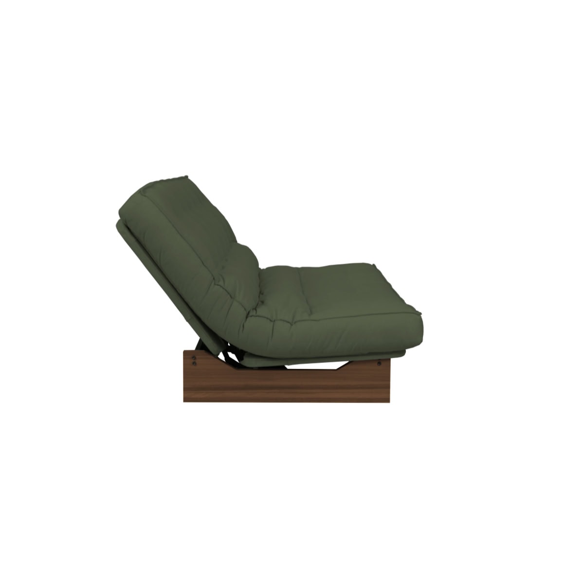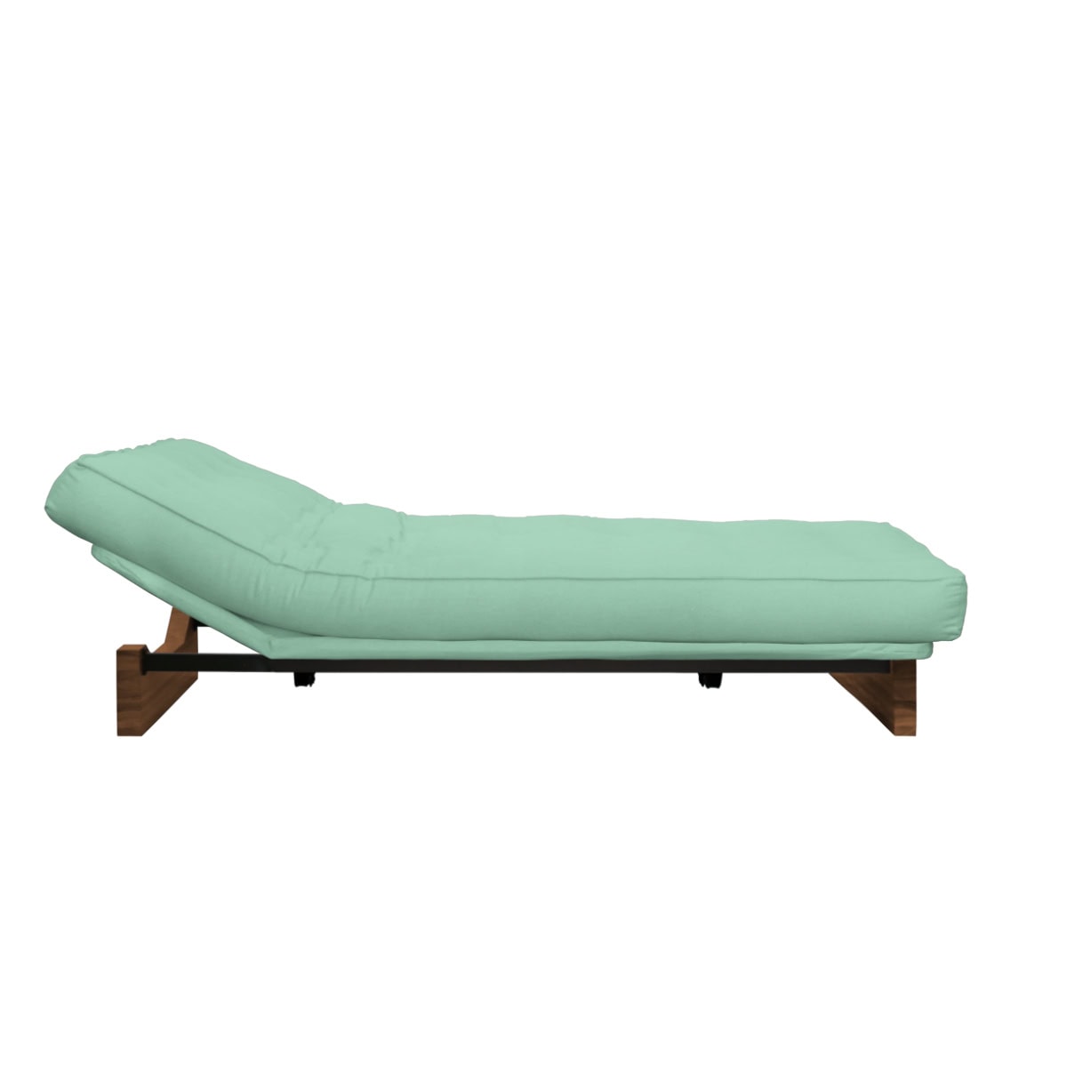 Sofá-cama Chicago com sistema ClicClac, base metálica, pés de madeira e futon capitonê. 3 posições: sofá, lounge e cama. Design moderno e funcional.